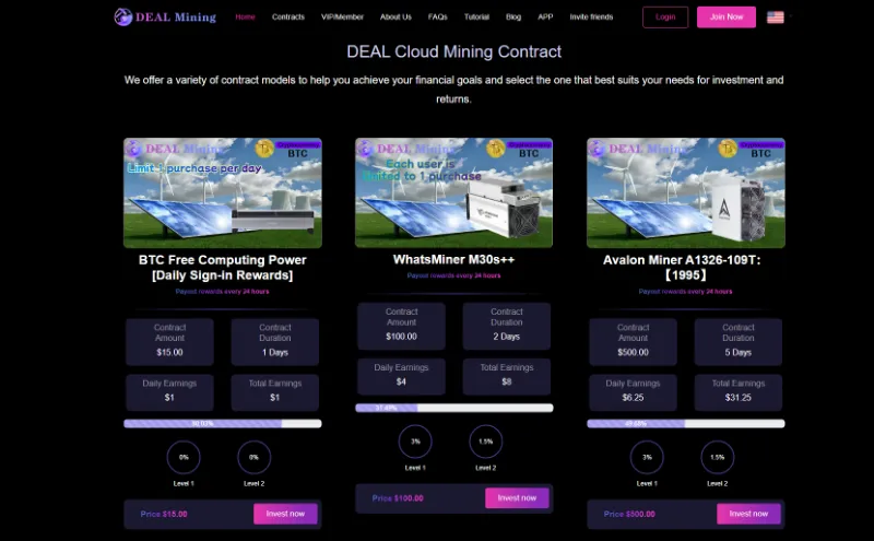 The platform often advertises cloud mining or mining contracts that allow you to earn from cryptocurrency mining remotely. However, there is no actual mining operation behind these promises. Instead, the website displays fabricated statistics and profit reports to lure you in.